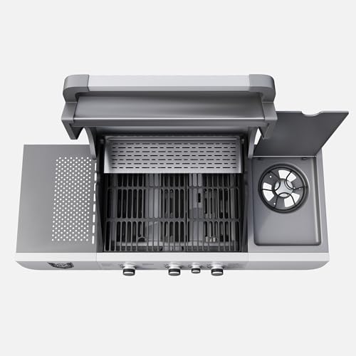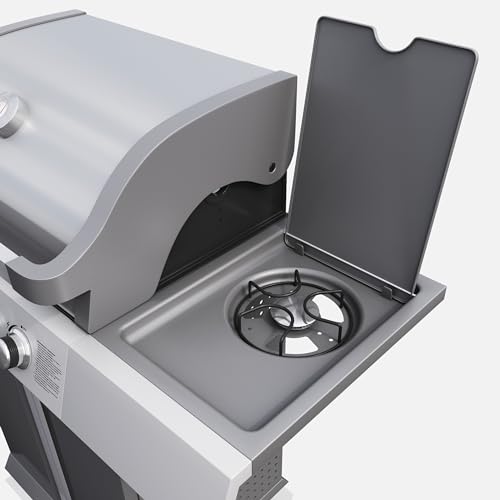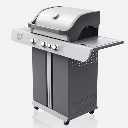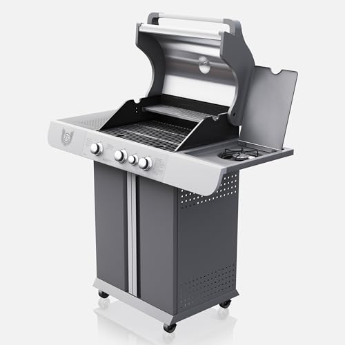 - ☑️ LEISTUNG: Mit 11,5 kW, verteilt auf drei Haupt- und einen Seitenbrenner, garantiert dieser Gasgrill gleichmäßige Hitze für perfektes Grillen