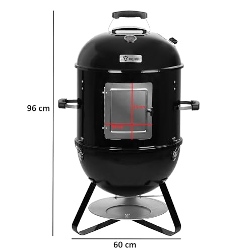 - EXTRAS | Mithilfe der im Lieferumfang enthaltenen Wasserwanne kann ein besserer Temperaturausgleich stattfinden und die Speisen werden saftiger. Die große Tür an der Vorderseite eignet sich ideal zum Nachlegen von Grillkohle, Briketts oder Räucherchips.