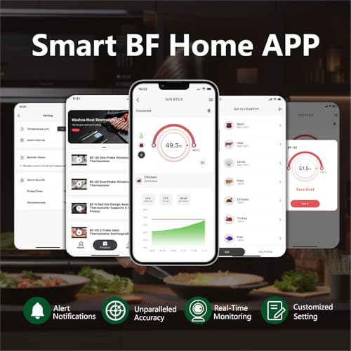 • Fernüberwachung Ihres Bratens: Halten Sie den Überblick über Ihren Garfortschritt mit der BF Home-App. Diese benutzerfreundliche App erfordert keine Registrierung oder komplexe Einrichtung. Sie bietet voreingestellte Temperaturwarnungen, Hoch-/Niedrigtemperaturalarme, Live-Daten-Grafik-Protokollierung (teilbar) und kann über 50 Garhistorien speichern.