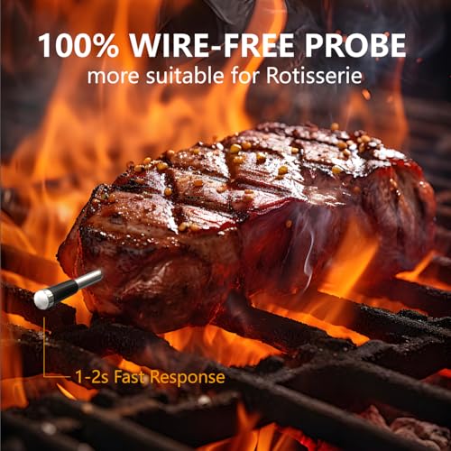 • 100% kabelloses Fühler: Dieses kabelloses Fleischthermometer für Grillen und Räuchern verfügt über einen 100% drahtlosen Fleischfühler, der eine bequemere Bedienung und Aufbewahrung ermöglicht. Ideal für Backöfen, Luftfritteusen, Rotisseries und mehr, damit Sie sich den Ärger mit verknoteten Kabeln ersparen!