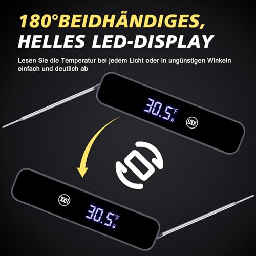 - 【Umkehrbares Display】Die reversiblen Display-Zahlen auf dem Bratenthermometer drehen sich automatisch, je nachdem, wie Sie es halten, und ermöglichen es Ihnen, die Zahlen aus jeder Richtung zu lesen, so dass es für Rechts- oder Linkshänder sehr einfach zu bedienen ist.