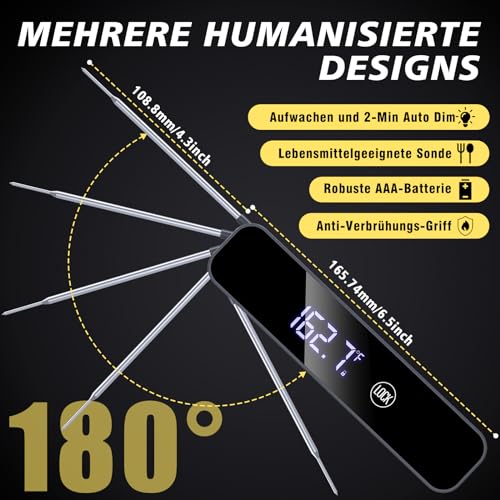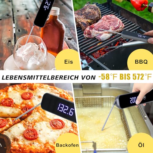 - 【Sofortiges Lesen-1 Sekunde Antwort】Das Fleischthermometer liefert genaue Temperaturmesswerte in weniger als 1 Sekunde und erkennt schnell die Temperatur Ihrer Lebensmittel, damit Sie die feinsten Aromen genießen können. Ideal für die Temperaturmessung von Steaks, Grillgut, Brot und Milch, Flüssigkeiten wie Getränken und gekühltem Bier. Temperaturbereich von -50°C bis 300°C (-58°F bis 572°F)