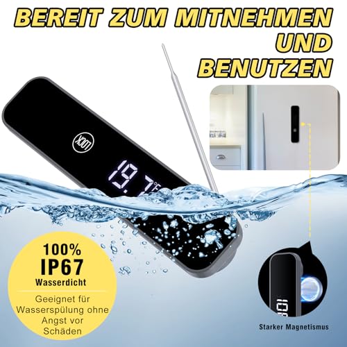 - 【IP67 Wasserdicht】Das Grillthermometer hat eine IP67 Wasserdichtheitsklasse, was bedeutet, dass Sie das gesamte Thermometer unter einem Wasserhahn waschen können, um die Sonde und den Bildschirm hygienisch sauber zu halten. Das digitale Fleischthermometer hat eine ergonomische. Das digitale Fleischthermometer hat einen ergonomischen Griff, der sehr bequem zu halten ist und eine gute Benutzererfahrung bietet.