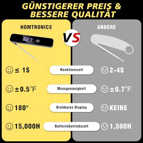 Homtronics Fleischthermometer, Grillthermometer Digital, IPX6 Wasserfest Küchenthermometer,1s sofortiges Bratenthermomete, Faltbar Lange Sonde für Grill, Küche, kochen, BBQ,…
