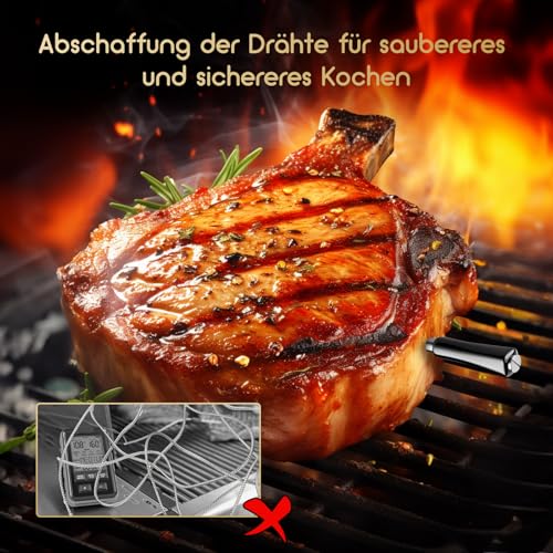 - Ein echtes drahtloses Fleischthermometer, das das Kochen freier und flexibler macht. Bluetooth 5.1 drahtlose Verbindung bis zu 91m/300ft. Ermöglicht es Ihnen, Ihr Essen von überall aus zu überwachen! Überwachen Sie Ihr Essen mit der KOSTENLOSEN App, die für iOS (12 und höher) / Android (7.1 und höher) Smartphones und Tablets verfügbar ist.