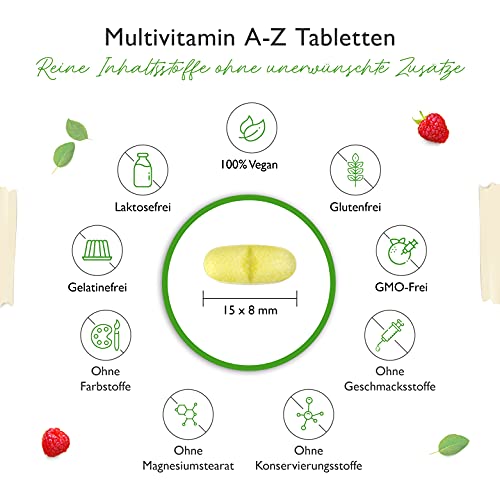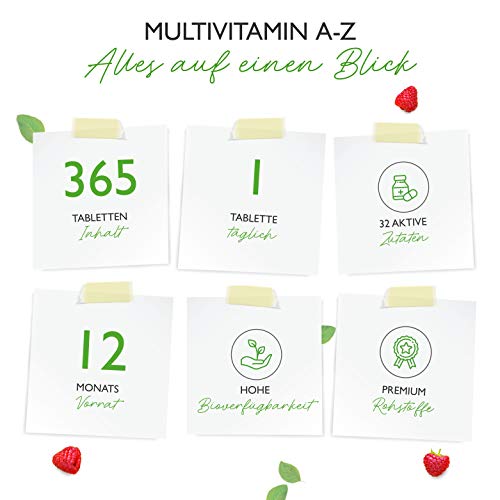 Details: Multivitamin A-Z – 365 Tabletten (12 Monate) – 32 aktive Inhaltsstoffe – Kombination aus Mineralien + Aminosäuren + Spurenelementen + Pflanzenextrakten – Vegan – Hochdosiert
