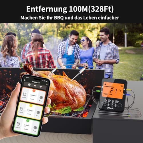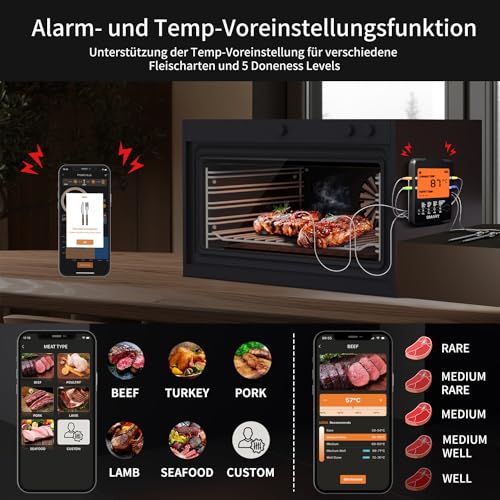 Grillthermometer Kabellos Smarte Fleischthermometer Funk Bratenthermometer für BBQ, Grill, Ofen, Backen, Drehspieß, Fernbedienung über Bluetooth 5.2 mit der Smart App,…