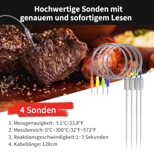 - 【 4 Thermometer Sonden 】 Dieses Fleischgrill Räucherthermometer kommt mit Vier hochpräzisen lebensmittelechten Edelstahlsonden, die gleichzeitig Vier Fleischsorten überwachen können. Die Sonde ist mit einem Präzisionstemperatursensor ausgestattet, der die Temperatur schnell und genau messen kann. Sondenparameter: Messgenauigkeit: ±1.0 ℃ (± 33.8) ℉), Antwortgeschwindigkeit: 2-4 Sekunden, Messbereich: 0 ℃ zu 300 ℃ (32) ℉ bis 572 ℉)”